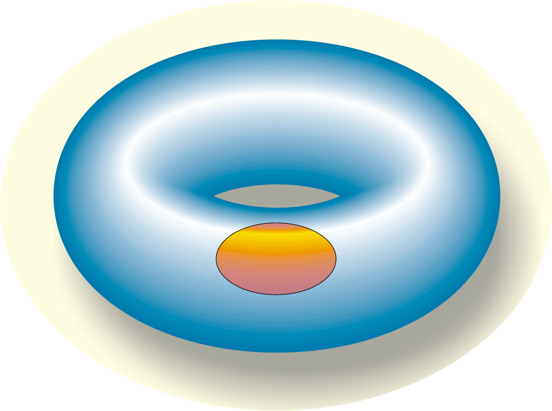 Figure 4. The Gauss—Bonnet formula (equation (3)) is illustrated here by a toroidal surface with one handle. The local curvature K is positive on those portions of the surface that resemble a sphere and negative on those, near the hole, that resemble a saddle. Because g, the number of handles, equals one, the integral of the curvature over the entire surface vanishes. One can make Shiing-shen Chern’s quantum generalization of the Gauss—Bonnet formula plausible by considering the angular mismatch of parallel transport after a circuit around the small red patch in the figure.