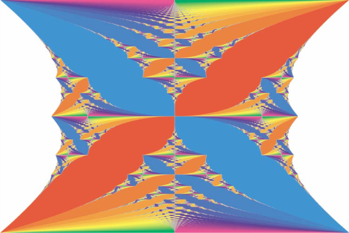 Figure 5. The Hofstadter “butterfly” is a fractal phase diagram of Douglas Hofstadter’s model of a quantum Hall system in a periodic potential. Each of the infinite number of phases is characterized by the Chern number of its Hall conductance and displayed with a different color. The horizontal axis gives the chemical potential, which determines the electron density. The left side corresponds to zero electron density. The vertical axis, indicating magnetic flux though the system, goes from zero at the bottom to one flux quantum per unit cell of the crystal lattice at the top. At higher fluxes, the phase diagram repeats periodically. Warm colors indicate positive Chern numbers; cool colors, negative numbers. Only on the extreme left and right do we see white spaces, which indicate Chern number zero.