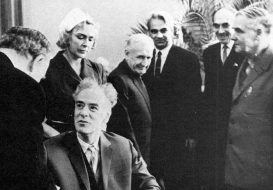Presentation of the Nobel Prize to Landau by the Swedish ambassador to the USSR (December 1962). Those present at the ceremony are (from left) Mrs Landau, Igor Tamm, Mstislav Keldysh, Nikolai Semenov, and Peter Kapitsa.