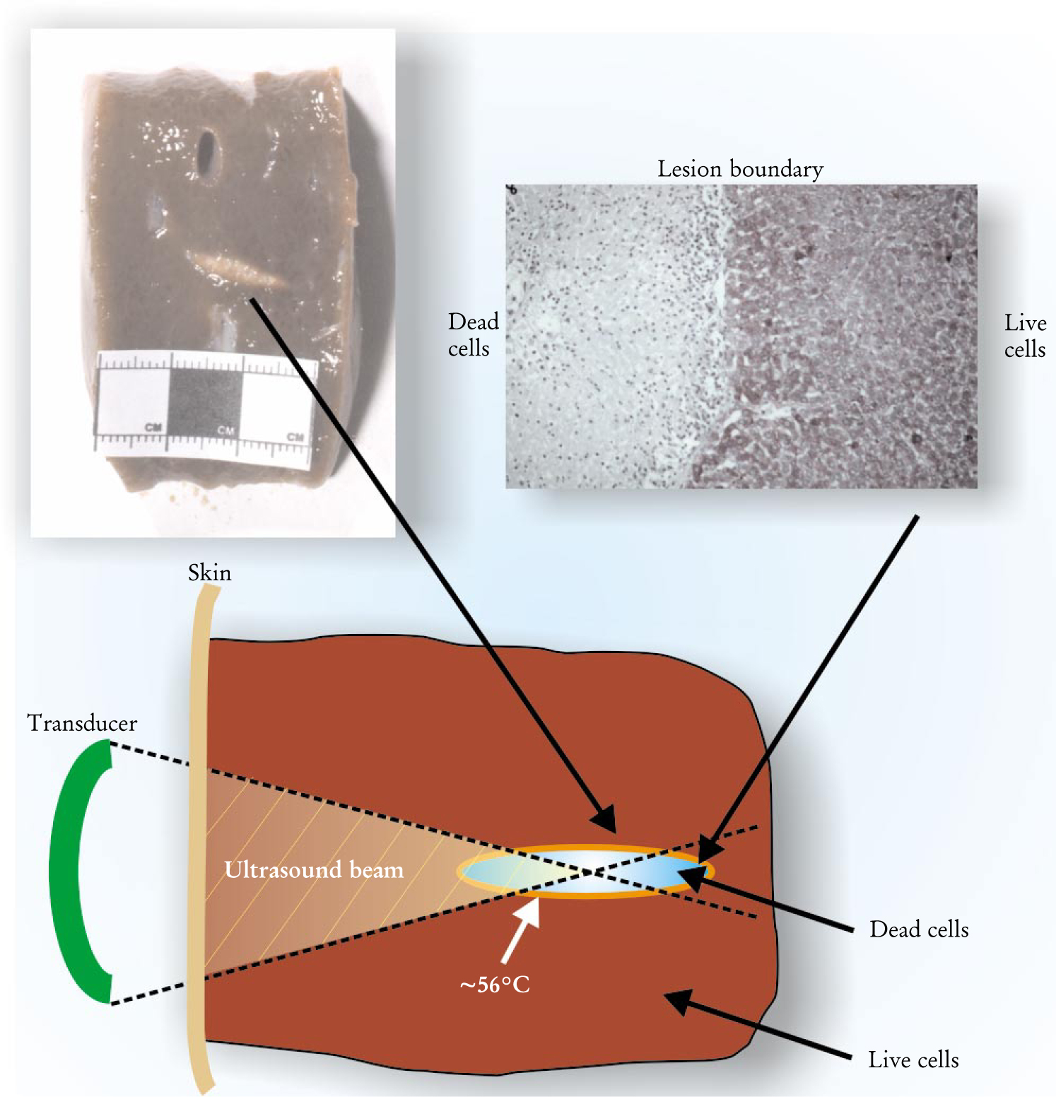 Figure 1. Focused ultrasound surgery brings a high-intensity beam of ultrasound to a tight focus within the target tissue volume, which may lie deep within the body. The beam passes through overlying skin and other tissues without harming them. As the ultrasound beam propagates through the tissue, it is absorbed and the tissue is heated. The temperature rise is approximately proportional to the ultrasound intensity, and the beam parameters are chosen so that biologically significant temperature rises are only achieved within the focal volume. Cells lying within the 56°C contour (orange) are killed if this temperature is maintained for 1 second or longer. There is a very sharp boundary between dead and live cells at this contour.