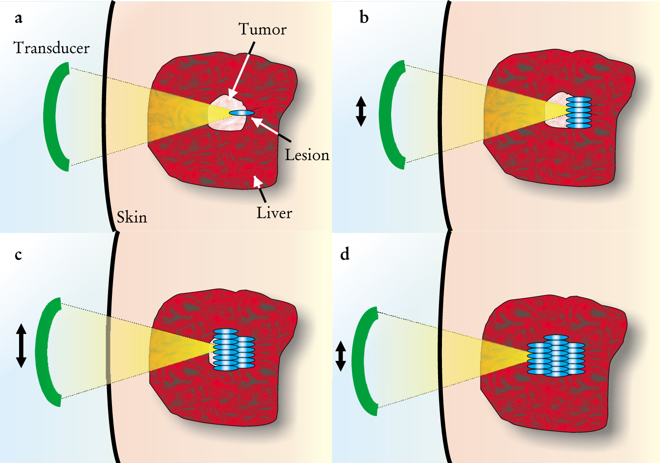 Figure 1 shows a schematic diagram of the principle of this technique, which is referred to synonymously as focused ultrasound surgery (FUS) or high-intensity focused ultrasound (HIFU).