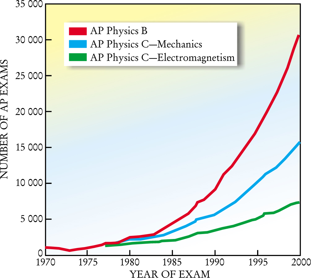 Twenty years ago, advanced programs affected only a few students. Over the past decade, however, AP participation has grown exponentially (see figure 1). In 2000, 433 000 AP exams were taken in math and science, an increase of almost a factor of three in a decade. In physics, the annual number of AP exams is nearly 60 000, representing approximately 51 000 individual students (since some take separate exams in both mechanics and electromagnetism). However, the College Board estimates that only about 66% of AP students take the exam, so the number of students taking AP physics courses may be closer to 78 000 per year. Clearly, these are no longer courses designed primarily for an elite audience of exceptional, high-ability learners. Those few truly exceptional students in each school may require courses offering greater independence.