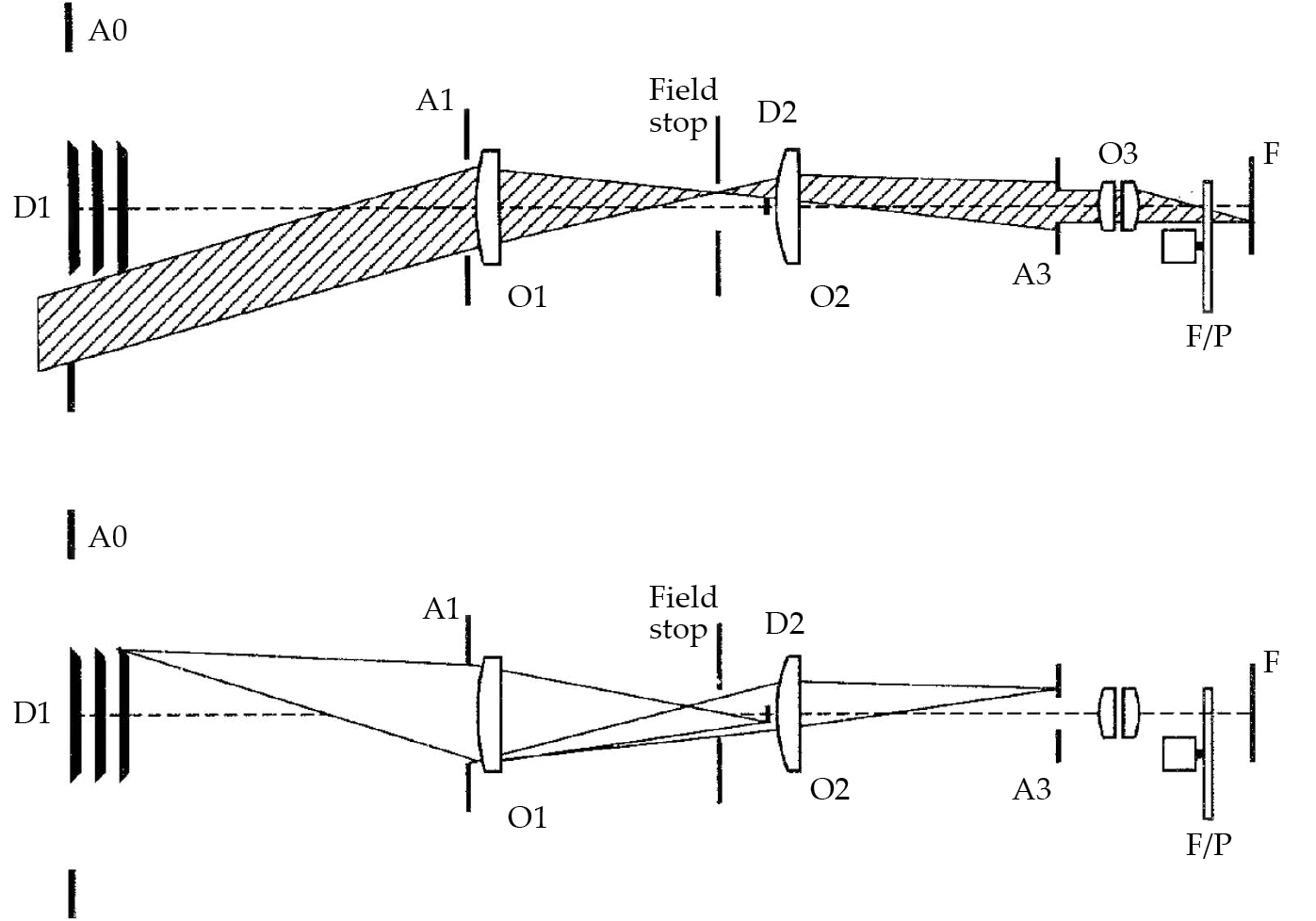 The Large Angle and Spectrometric Coronagraph C3 on the Solar and Heliospheric Observatory (SOHO) satellite. The top diagram illustrates image formation; the bottom diagram shows how stray light is blocked from reaching the image plane. Sunlight enters from the left. The components shown are the front aperture (A0), external occulter (D1), entrance aperture (A1), objective lens (O1), field stop, internal occulter (D2), field lens (O2), Lyot stop (A3), relay lens with Lyot stop (O3), filter and polarizer wheels and shutter (F/P), and focal plane (F). (Adapted from ref. 10.)