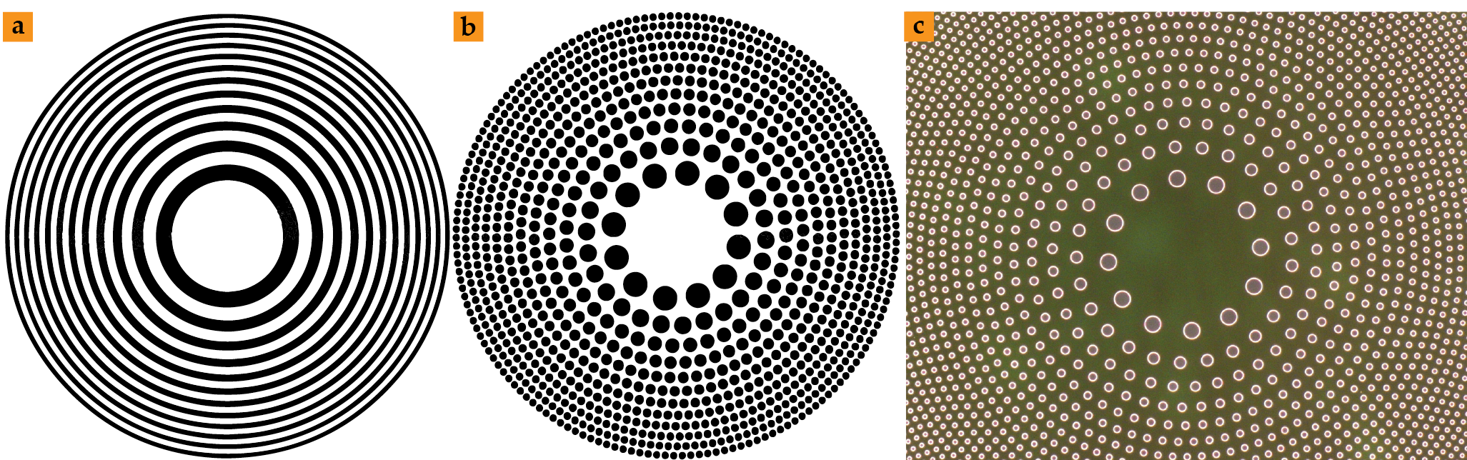 Zone plates are one way to image the Sun near the diffraction limit. (a) A classical Fresnel zone plate has concentric rings with decreasing widths. (b) The photon-sieve variant has concentric rings of circles with decreasing radii. (c) A fabricated photon sieve needs to be precise to achieve the high-resolution images desired. The one seen here has holes as small as 2 µm in diameter. (Panels a and b courtesy of Adrian Daw; panel c courtesy of Kevin Denis.)