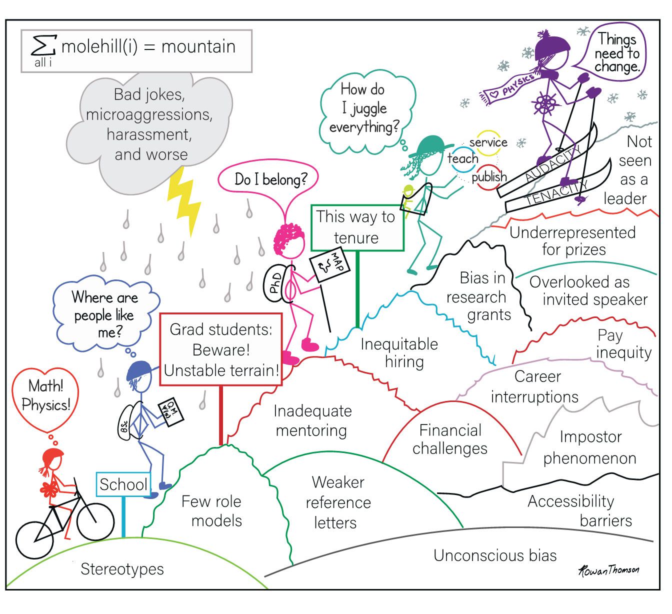 Even a single molehill may be sufficient to deter an individual from entering the field or to motivate their departure. Individuals who do persist face disadvantages that compound over time. The summative effect of molehills creates a mountain that members of underrepresented groups must overcome (see figure 1). The result is a loss of talent, a lack of recruitment, and other inequities that hamper the full realization of human potential in physics.