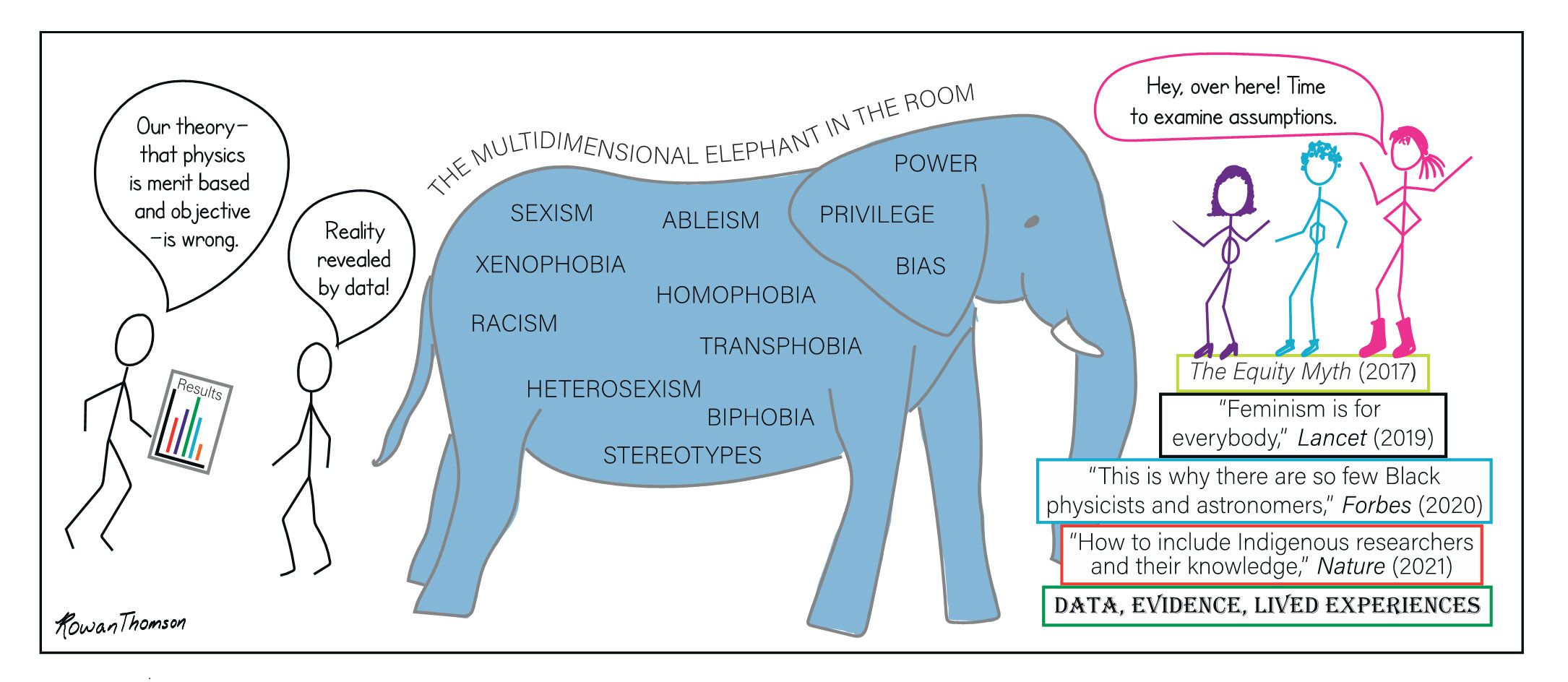 Looking around the lunchroom on my first day at my first job in physics—as a summer student in a Canadian national laboratory—I was shocked to see that almost all the scientists present were white men! I loved that job and was thrilled to be paid to do physics, but I was disappointed in the lack of diversity at the lab. I expected that things would get better as I continued in my career. Surely, I thought, the diversity of the general population would begin to be reflected in physics. But 20 years later, my optimistic expectation has proven naive. The lack of diversity in physics is still striking. Moreover, the issues in the field go beyond representation. Insidious inequities, pernicious discrimination, and systemic barriers continue to prevent the inclusion of everyone in physics.