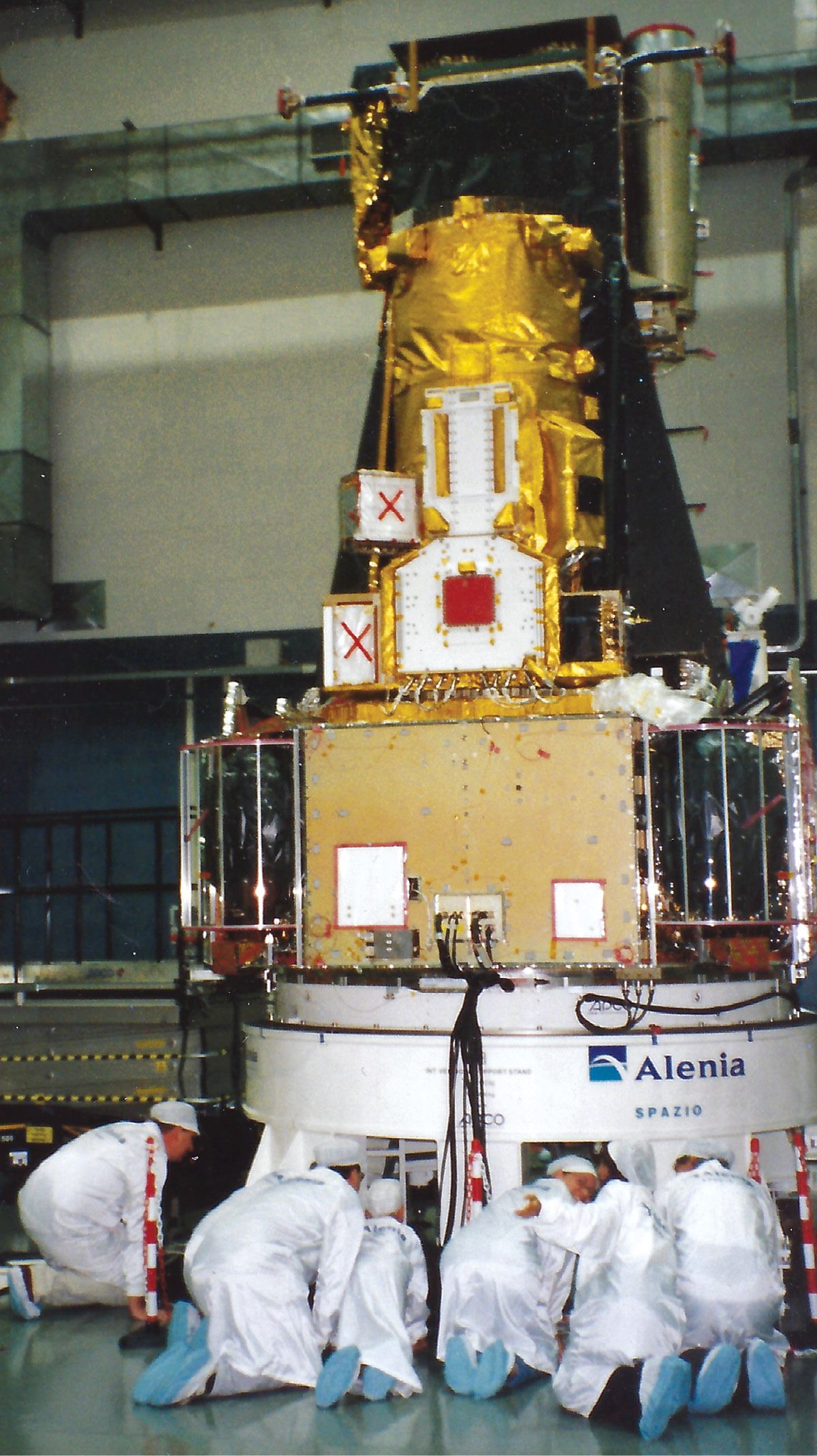 My favorite picture from my time in Switzerland: Part of the INTEGRAL (International Gamma-Ray Astrophysics Laboratory) software team visiting the hardware before launch. My behind is third from the right. (Courtesy of Peter Kretschmar.)