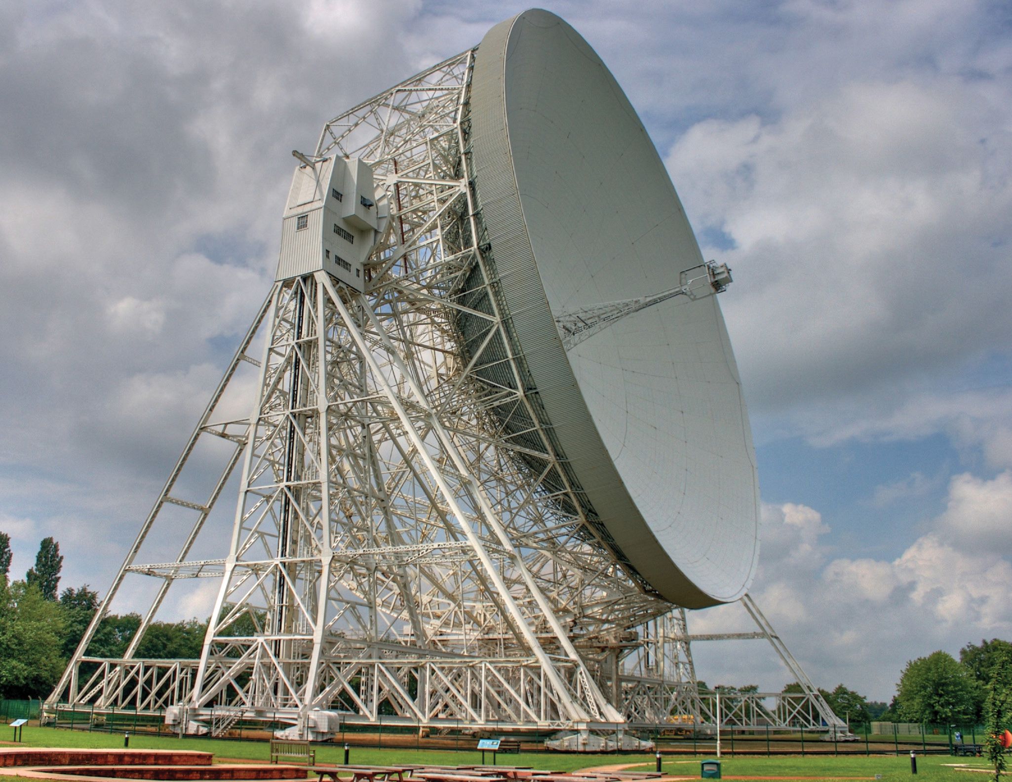 The famous Lovell Telescope at Jodrell Bank Observatory in the UK. During the space race, the 76.2-meter telescope tracked US and Soviet spacecraft. Pictured is the view from my office: Every time the telescope moved, I gawked like a tourist. (Courtesy of Mike Peel, Jodrell Bank Centre for Astrophysics, University of Manchester, CC BY-SA 4.0.)