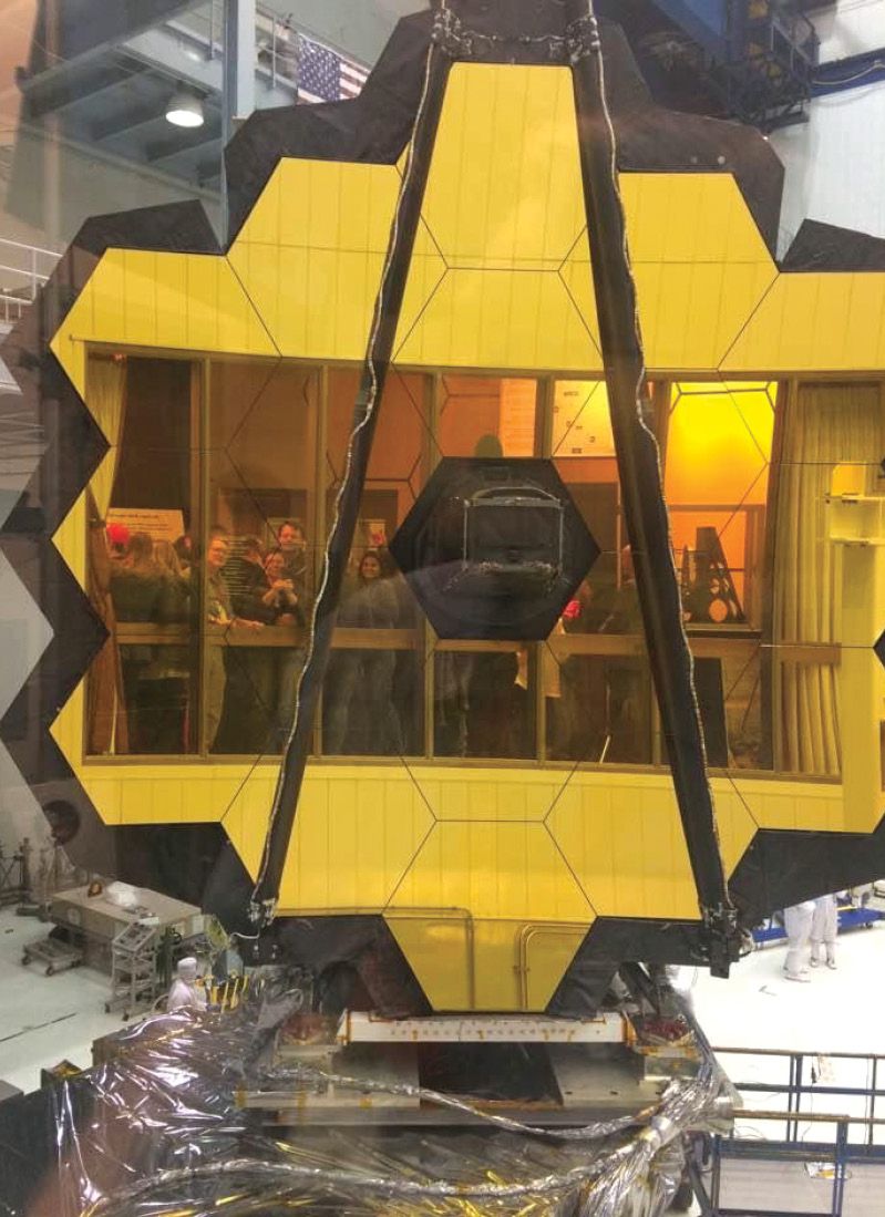 My Goddard colleagues and I reflected in the mirror of the James Webb Space Telescope in 2017. After the telescope was assembled in Goddard Space Flight Center’s large clean room, the mirror was deliberately positioned to face the observation hall for several weeks so that we could have the amazing view pictured here.