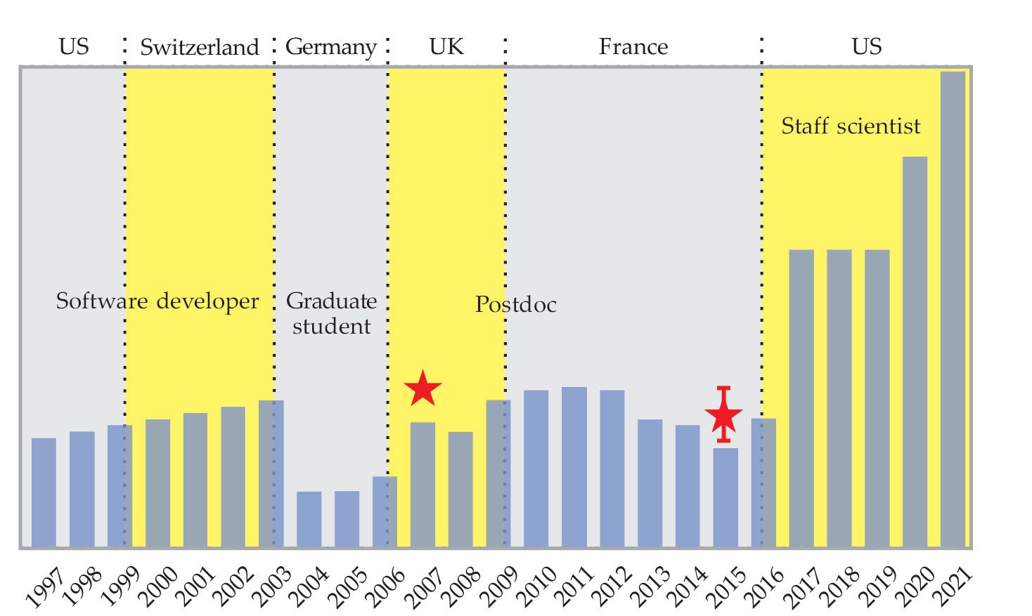 My salary history. Noteworthy elements include the steady salary growth in my first real job (1997–2003) at Goddard Space Flight Center; the huge drop when I went back to graduate school in fall 2003; the drops when my funding agency at the Institute for Research in Astrophysics and Planetology (IRAP) changed (2013 and 2014); the flat salary of a university scientist who only gets a raise when given one by the state legislature (2017–19); and the dizzying rise to stability on the federal pay scale in 2020. The star in 2007 is the salary I turned down at the Rutherford Appleton Laboratory, and the star with the error bar in 2015 is the tenured salary range I would have had if I had received one of the CNRS-funded positions at IRAP.