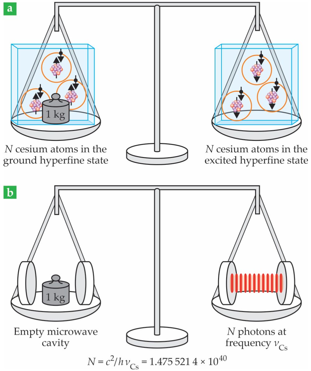 The new kilogram definition can be understood as (a) the mass difference between 1.475 521 4 × 1040 cesium atoms in the ground state and the same number in the excited hyperfine state or as (b) the mass of 1.475 521 4 × 1040 photons at the Cs hyperfine frequency trapped in a microwave cavity. The definitions of Planck’s constant
