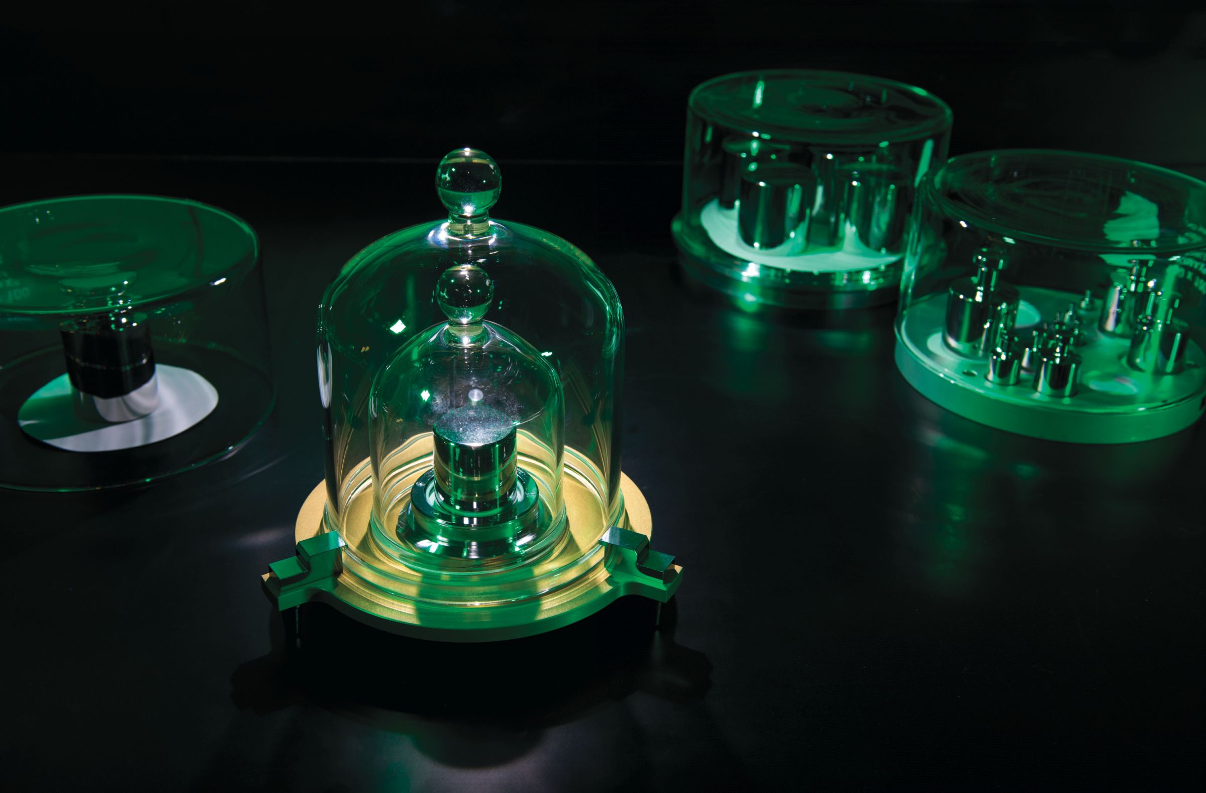 The platinum–iridium cylinders are replicas of the one in Paris that defined the kilogram until 2019. (Courtesy of J. L. Lee/NIST.)