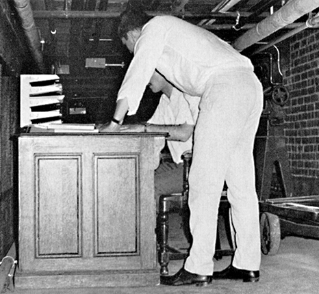 Figure 2. A steam tunnel below the University of Illinois electrical engineering building served as the first office and lab space for Bill Fry (seated) and his brother, Frank (leaning over). The ceiling was so low that the brothers couldn’t stand up straight.