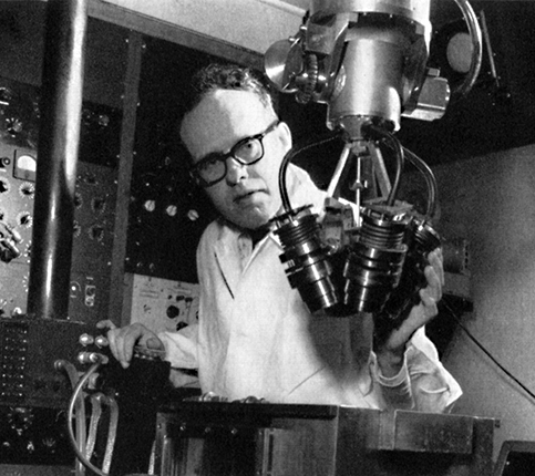 Figure 3. A novel transducer designed and built by Bill Fry (shown), Frank Fry, and coworkers combined four individual transducer elements to create a highly localized, intense ultrasound spot.