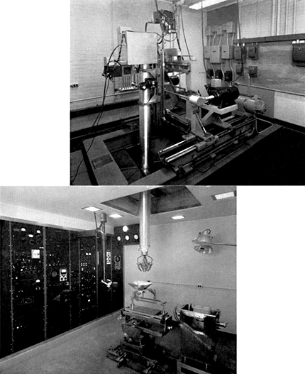 Figure 4. The heavy, elaborate structure in the upper photo allowed for precise positioning of the ultrasonic focus in a room below (lower photo). The positioning system is controlled from below, in the irradiation room.