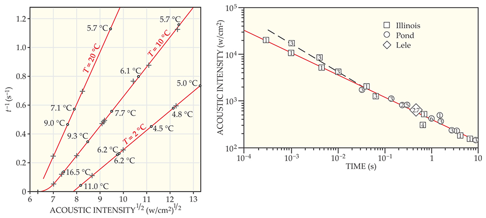 Figure 5. Dosage curves relate physical properties of applied ultrasound to a biological effect. (a) The curves here indicate, for anesthetized mice prepared at various temperatures T, the time (t) and intensity at which 50% of the subjects exposed to 982-kHz ultrasound experienced paralysis in a hind limb. Also indicated, near the data points expressed as circles, are maximum observed temperature rises. (Adapted from ref.