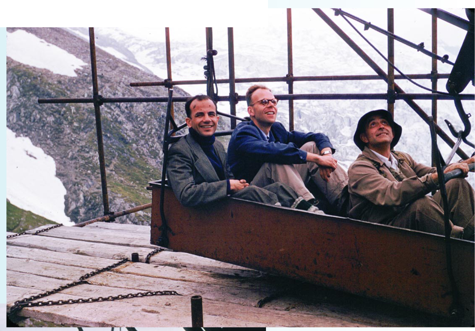 The school’s director and founder, Cécile De Witt, scheduled a welcome respite from classes for the quatorze juillet holiday and suggested various excursions for the day. As one excursion, she negotiated for Fermi and three others of us a rarely granted invitation to visit the cosmic-ray laboratory maintained by the Ecole Polytechnique near the peak of the Aiguille du Midi. It was an exciting prospect, though its safety raised some questions. The great cable car system that takes tourists up to the Col du Midi was only in the earliest stages of construction in those days. We were to make the ascent, not in enclosed cars over two vast spans of cable as present visitors do, but in four stages on whatever cable conveyances were used to transport materials or workers for the construction project. And one of those conveyances had flipped over the year before, killing two workers.