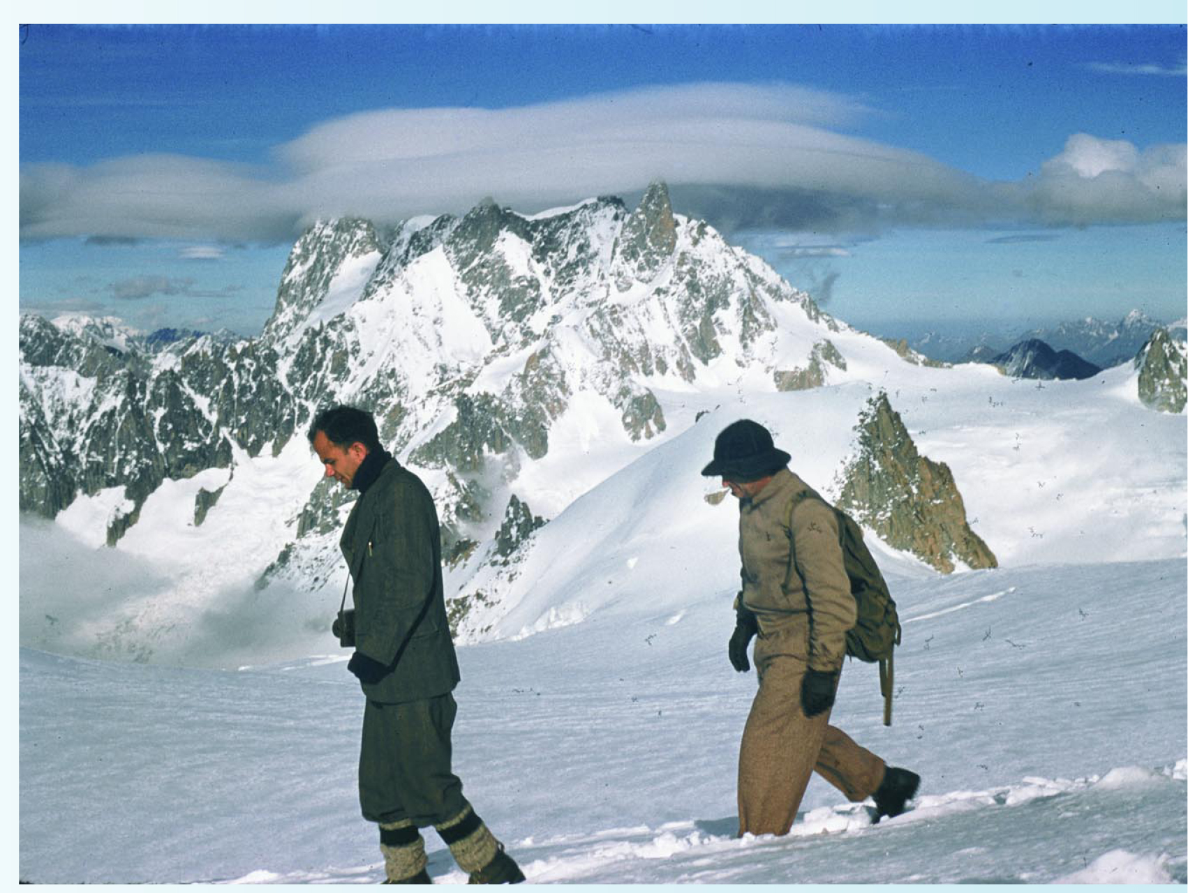 The second stage of the ascent. Fermi and van Hove gaze at the nearby Glacier des Bossons.