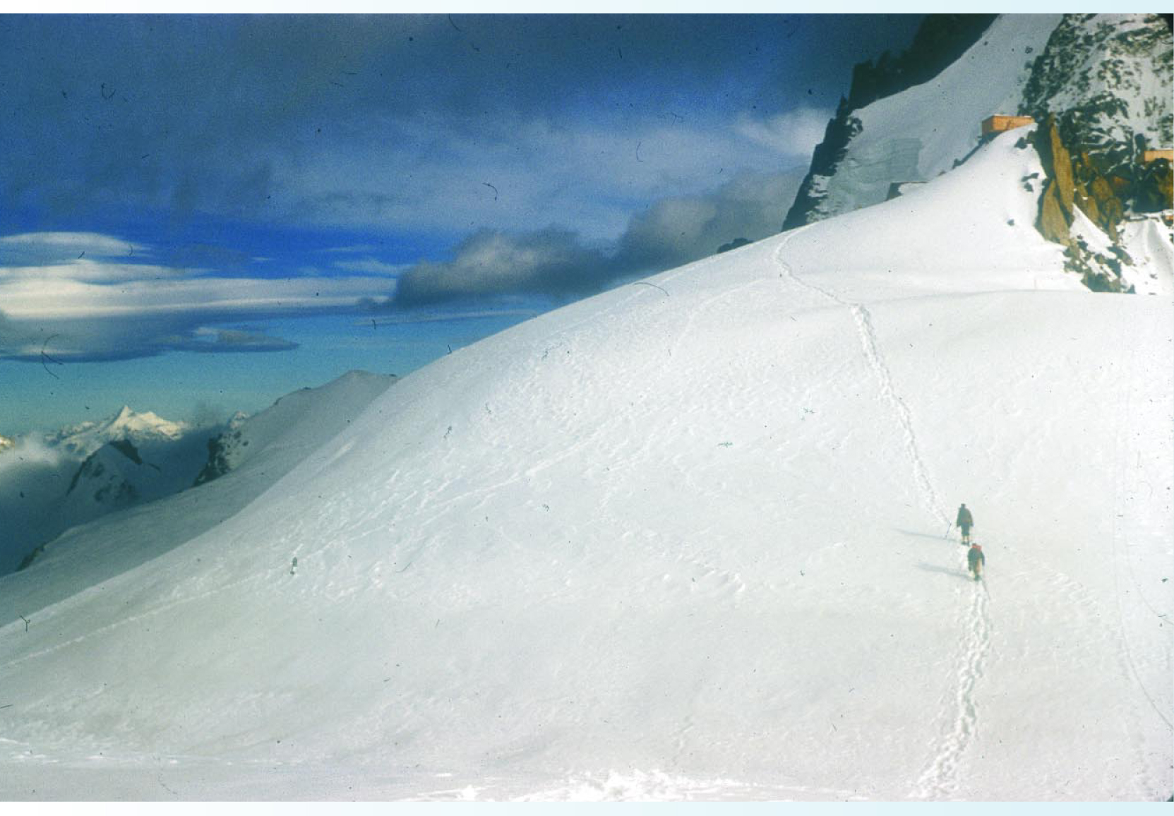 Besides Fermi, our party of four consisted of van Hove, a student from Egypt, Afaf Sabry, and me—as official photographer. We arrived at the foot of the mountain in the early afternoon and were not altogether surprised to be asked by an attendant to sign accident indemnity waivers before boarding the first of our four conveyances. It was the decaying remains of a cable car that must have been run for tourists generations earlier. Fermi gazed heavenward and hoped out loud that the cable was in better shape than the car. Fortunately, it only mounted to the foot of the great hanging Glacier des Bossons.