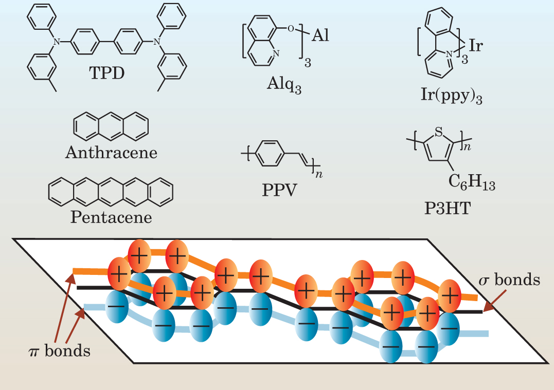 Figure 1. A gallery of organic semiconductors. These delocalized-electron systems can be identified by their alternating single and double carbon–carbon bonds. Molecular materials such as TPD, Alq3, and Ir(ppy)3 are widely used in LEDs, and pentacene and others in FETs. Polymer semiconductors have π molecular orbitals along the main chain and are also used in LEDs (PPV) and in FETs (P3HT). The bottom panel is an artist’s impression of the π molecular orbitals on a PPV chain segment. To form the molecule, an sorbital for each carbon atom becomes mixed with two of the p orbitals (sp2 hybridization), resulting in the σ bonds (black) that hold the molecule together. This leaves one electron per carbon atom in a pz orbital. The overlap of the pz orbitals (red and blue) of neighboring carbon atoms allows the delocalization of those electrons into π orbitals along the polymer backbone.