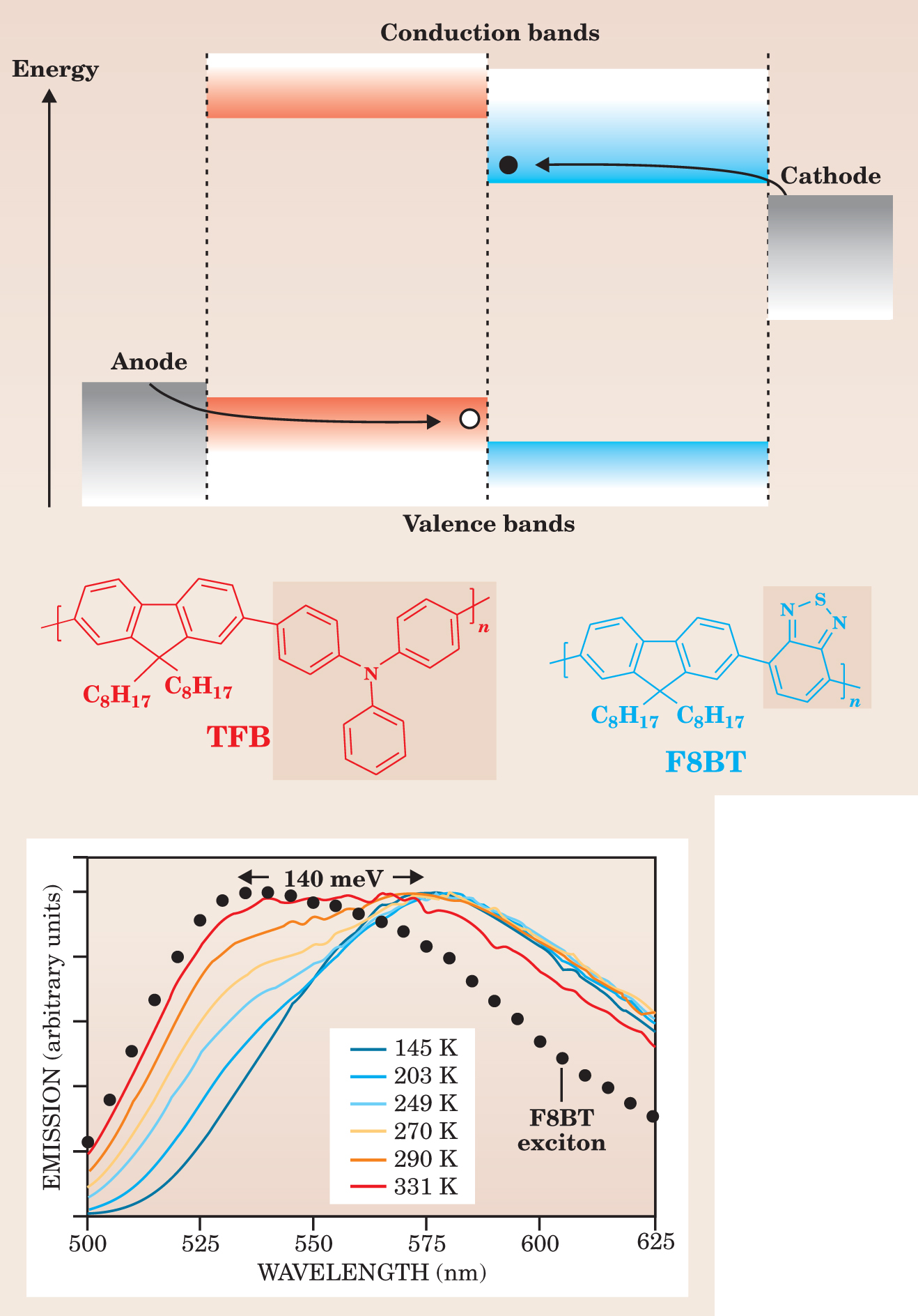 Figure 2. The energy level diagram of an organic semiconductor LED (top), formed from two semiconductor layers set between an anode that injects holes and a cathode that injects electrons. The properties of the heterojunction formed between the two semiconductors are determined by the different energies of highest occupied (valence-band) state and lowest unoccupied (conduction-band) state across the junction. Those energy levels can be tuned by selecting appropriate materials. Of the two polymers shown in the middle panel, the shaded triphenylamine group in TFB is a good electron donor. The shaded benzothiadiazole group in F8BT is a strong electron acceptor. F8BT thus has a high electron affinity or low-lying conduction-band edge. The energy offsets in the conduction and valence bands block injected holes and electrons from reaching the opposite electrode. That promotes electron–hole capture and exciton formation at the heterojunction. The effect of the two polymeric semiconductors is to produce an efficient LED with green-yellow emission at efficiencies greater than 20 lumens per watt. The emission spectrum (bottom) from a TFB–F8BT heterojunction shifts to lower wavelengths with increasing temperature as interfacially trapped excitons migrate into the bulk of F8BT. The black dots signify emission from the F8BT polymer alone.