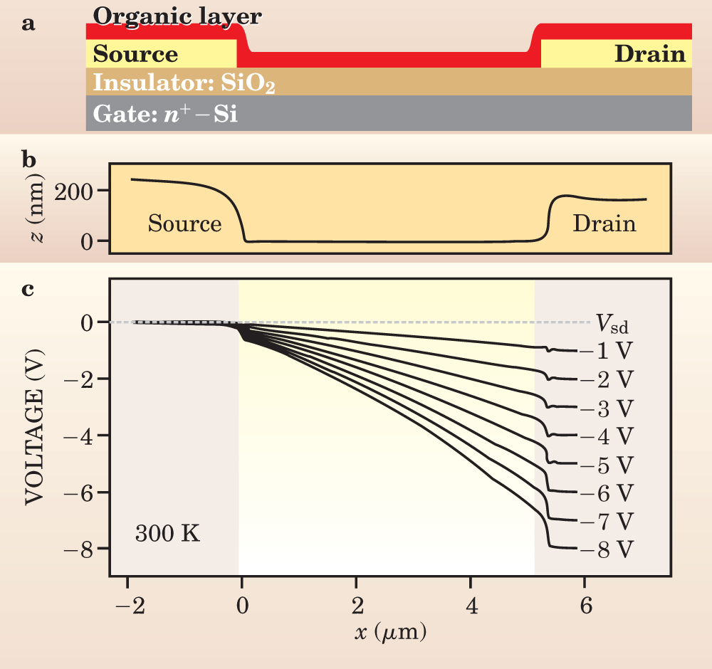The transistor’s open structure makes it amenable to direct probing of the electric potential across the source–drain channel. Daniel Frisbie (University of Minnesota), Thomas Jackson (Pennsylvannia State University), and Lukas Burgi and Henning Sirringhaus (Cambridge) have directly observed device operation using, for example, a Kelvin probe