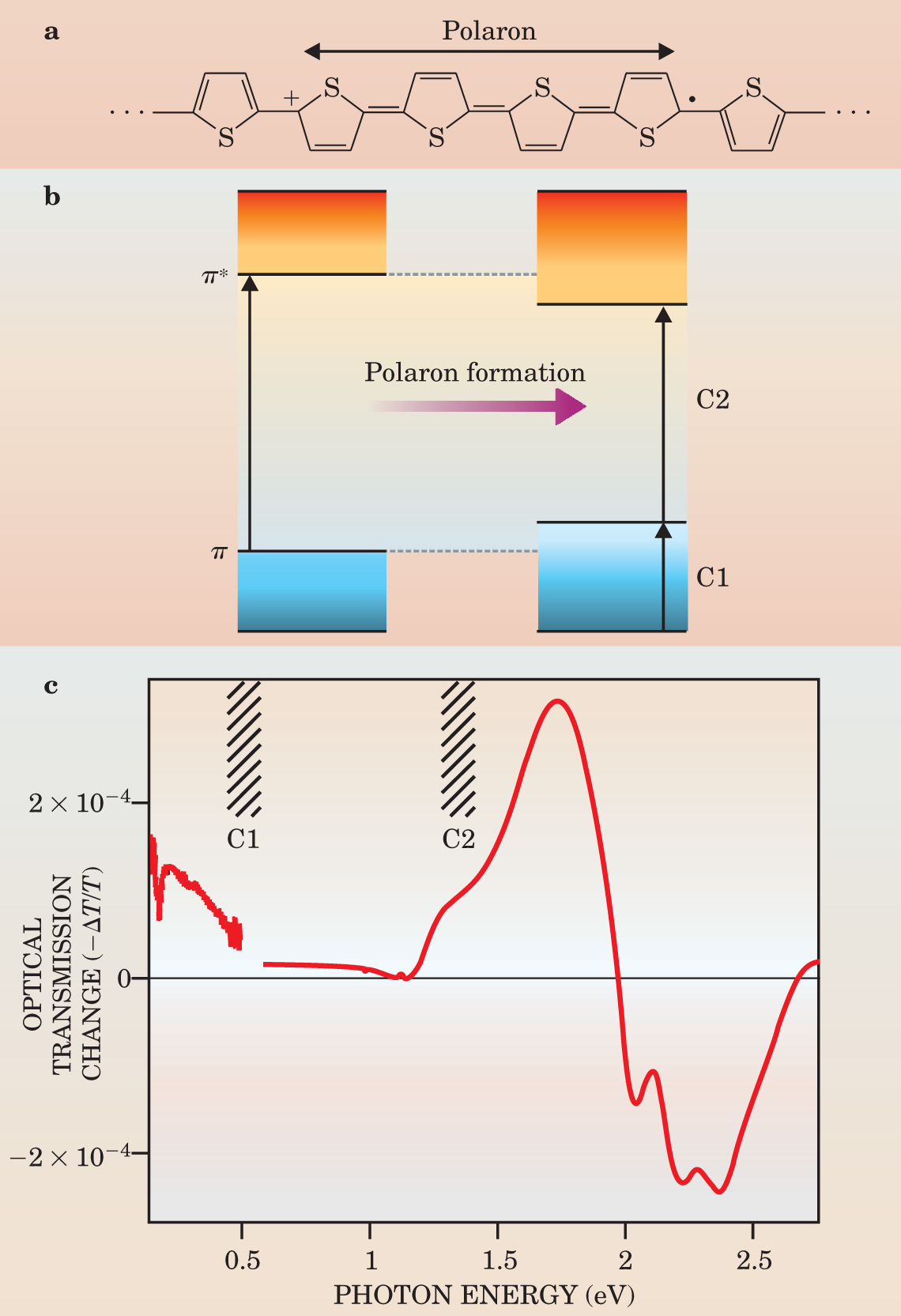 Figure 4. A positively charged polaron associated with the presence of a hole can be represented by a local change in the chemical structure (a) along a section of a polythiophene chain. To accommodate the hole, the chain alters its bonding pattern, shown schematically here over a length of 4 thiophene units. (b) Such localized defects in bonding prompt the valence- and conduction-band states to move into the energy gap. The changed energy states are manifest as new absorption bands at 0.5 eV (C1) and 1.3 eV (C2). (c) The change in those energy levels can be measured as a change in optical transmission −ΔT through an FET when the gate voltage is applied. Plotted as −ΔT/T, the positive signals correspond to induced absorption, as seen below 2 eV, and the negative signals to “bleaching,” the loss of ground-state bands above 2 eV. The transmission spectrum changes on well-ordered polythiophene-based films (P3HT) with field-induced charge doping are characteristic of delocalized free charges. The weaker contributions from the C1 and C2 polaron bands are associated with chemical doping.16