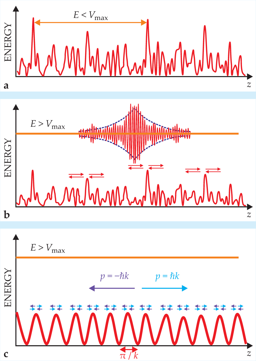 Figure 2. Localization of a particle in a speckle potential. (a) When the particle’s energy E (orange) is smaller than the highest peaks Vmax of the potential (red), localization results from trapping between the two peaks and can be understood in classical terms. (b) If the energy is larger than the highest peak, solving the Schrödinger equation one can find an exponentially localized wavefunction (the purple envelope), which results from the addition of many wavelets scattered on the peaks, as suggested by the arrows. This quantum localization phenomenon is akin to Anderson localization. (c) In a periodic potential of spatial frequency 2k, a particle with momentum p = ħκ cannot propagate because it is Bragg reflected, the result of many wavelets scattered from the periodic structure. Localization in panel b can thus be interpreted as Bragg reflection of each momentum component of the particle by the corresponding spatial frequency component of the disordered potential.