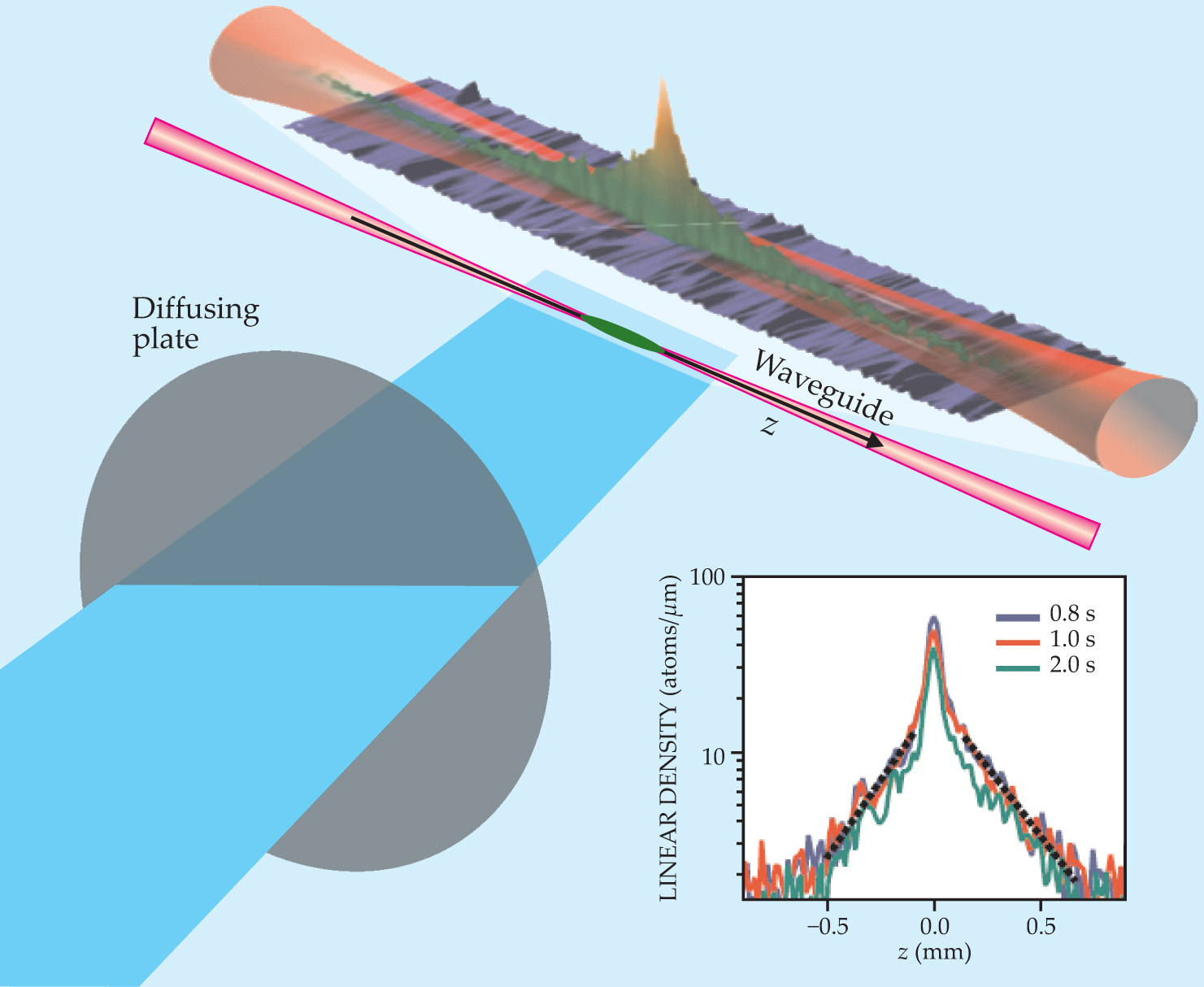 Figure 3. Anderson localization of ultracold atoms. The atoms are held by a matter waveguide that confines them transversely to the z-axis, but lets them travel freely along z. A laser beam passing through a thin aperture (elongated in the z direction) in a diffusive plate creates a disordered intensity pattern that varies rapidly along z and smoothly perpendicular to it. When a small Bose–Einstein condensate, initially confined along z, is released in the disordered potential, its expansion stops after about 0.5 s, after which a stationary density profile with exponentially decaying wings emerges. The semilog plots of the profiles at times 0.8 s, 1 s, and 2 s confirm the localization.