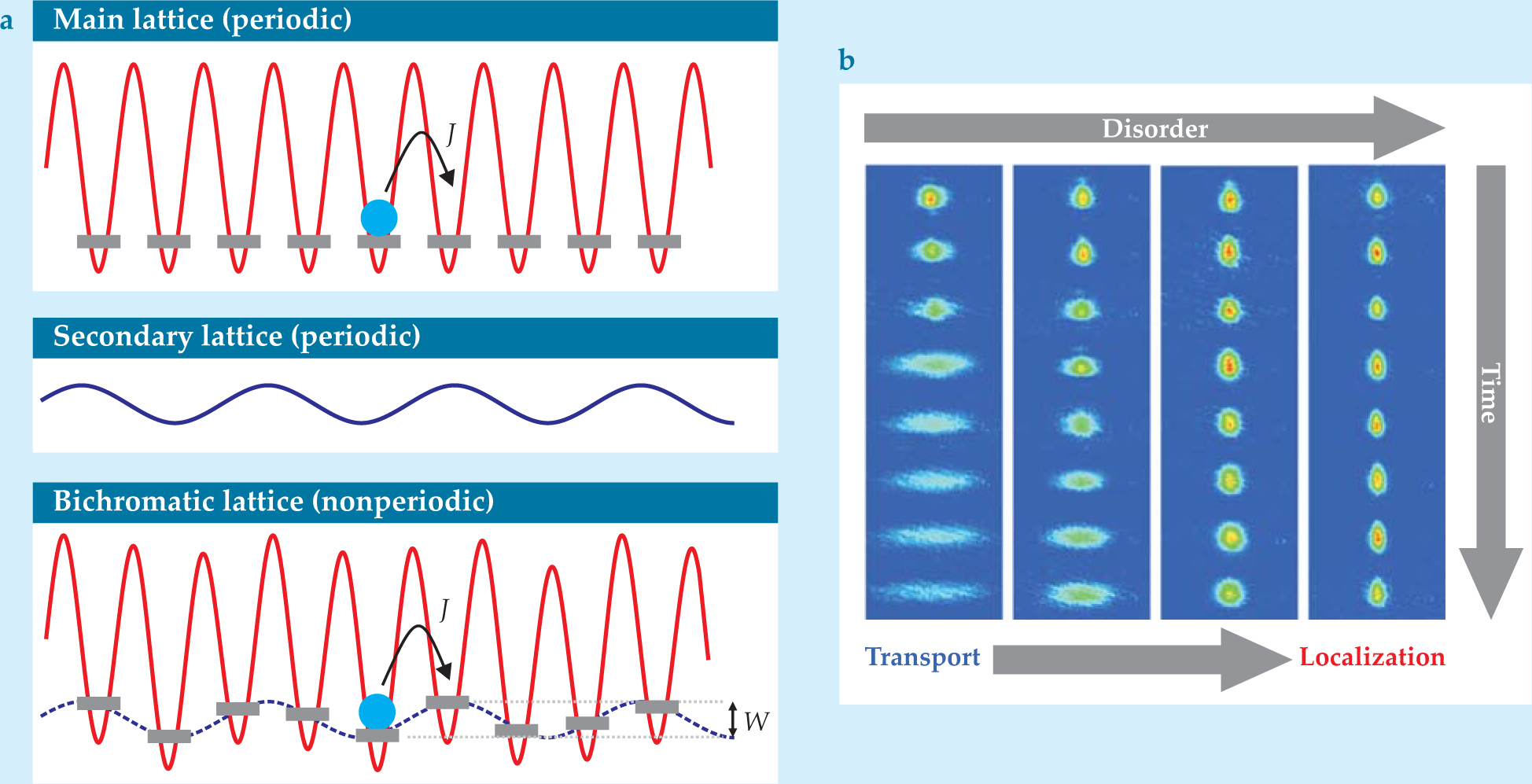 Figure 4. A bichromatic lattice simulates solid-state model. Loaded in a laser standing wave, an ultracold atom (blue) experiences a periodic potential. (a) The tunneling energy J can be controlled by changing the intensity of the main standing wave. A second, weaker optical lattice with an incommensurate spacing breaks the translational invariance and scrambles the site energies, as in the original solid-state model introduced by Philip Anderson. (b) Time-resolved images of almost noninteracting potassium-39 atoms. The atoms are first loaded into a few central sites of the bichromatic lattice and then observed diffusing into that nonperiodic structure. An increase in disorder leads to a decrease in diffusion and eventually its absence when the amount of disorder W becomes on the order of J.