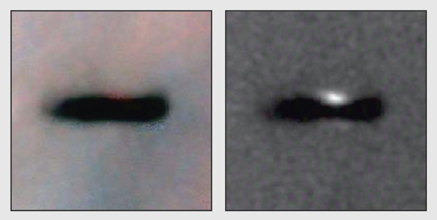 Figure 1. A protostellar disk in the Orion Nebula, viewed edge-on by the Hubble Space Telescope. The left image was generated with a camera that is sensitive to radiative emission lines from the gaseous disk; the right image was taken with a filter that blocks those lines. With the disk gas less prominent, reflected light from the central star is clearly visible. (Courtesy of Mark McCaughrean, C. Robert O’Dell, and NASA.)