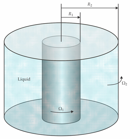 Figure 2. Taylor–Couette flow. Pictured here is a Taylor–Couette cell, in which differentially rotating flow is driven between two concentric cylinders—an inner cylinder that rotates at angular velocity Ω1 and an outer one rotating at Ω2. Using either water or liquid metal as a medium and choosing Ω1 > Ω2 and R12Ω1 < R22Ω2, one can set up the conditions relevant for studying the rotational dynamics of accretion disks. The end caps on the top and bottom of the device can profoundly affect the global stability of such flows, but as described in the main text, it is possible to control or minimize that undesirable effect.