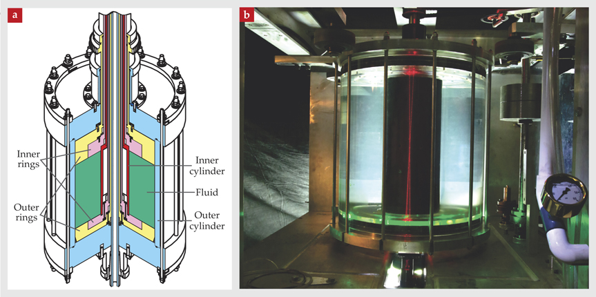 A group from the University of Twente in the Netherlands plans to join the Princeton and Maryland teams in a three-way collaboration hoping to reach a consensus. With help from the Maryland group, torque diagnostics will be added to the Princeton group’s new device, shown in figure 3b, for comparisons with laser Doppler velocimetry results. In addition, the Twente researchers will run an independent diagnostic with particle image velocimetry in a long Taylor–Couette apparatus