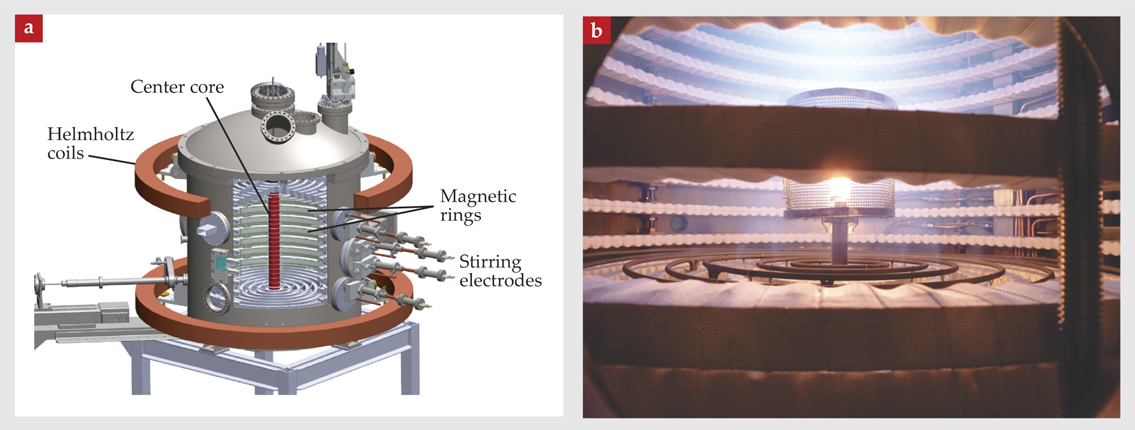 Figure 4. The University of Wisconsin plasma Couette experiment.(a) The magnetic rings shown in this schematic are responsible for confining the plasma. The edge of the plasma is stirred by applying an electric field across the magnetic field; viscous forces then ensure that the entire plasma flows. (Adapted from ref. 18.) (b) This photograph shows the glowing plasma, which is made by hot electrons emitted from the central core. The containment vessel is about 1 m in diameter. (Courtesy of Cami Collins and Cary Forest.)