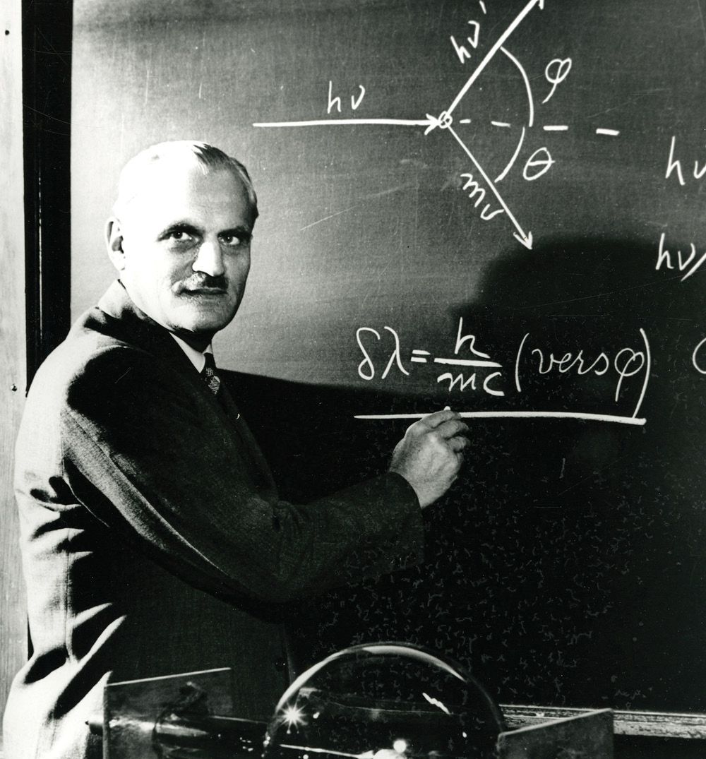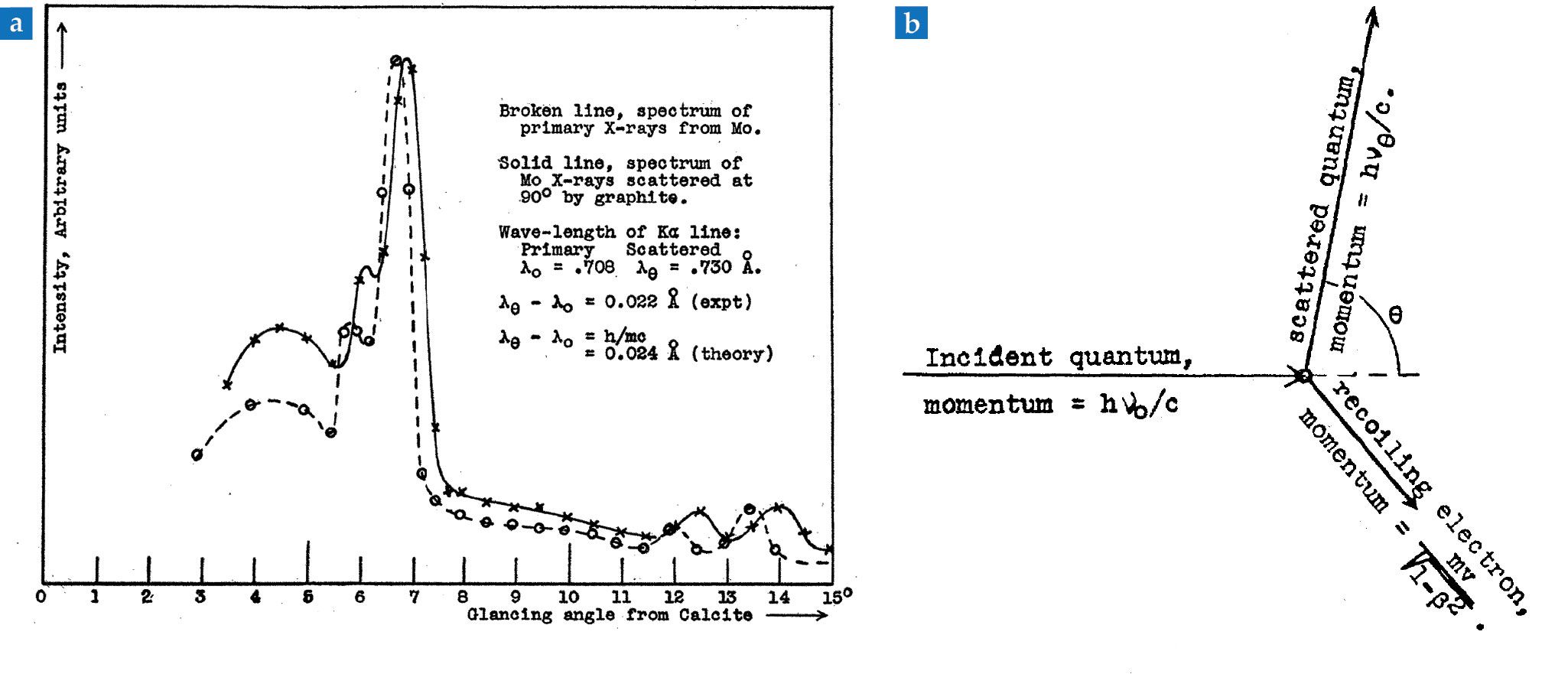 In November 1922 Arthur Holly Compton sketched a diagram for his students at Washington University in St Louis, Missouri. From the left, a photon, or “incident quantum,” collides with a stationary electron, which causes the pair to recoil and conserve momentum and energy. That was the first time Compton shared his breakthrough formulation of x-ray scattering from electrons. 1 A month later he delivered the same message to the American Physical Society; shortly thereafter his paper “A quantum theory of the scattering of x-rays by light elements” appeared in the Physical Review. 2
