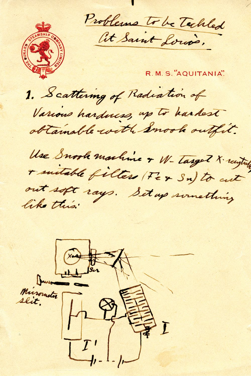 Buoyed by those experiences, Compton returned to the US to take up a position at Washington University in St Louis. It may be surprising that he chose a university that at the time, in his own words, “was a small kind of place,” but Compton was intentionally seeking to avoid the centers of x-ray science, where he worried he might be “led away by the thinking of the time” (reference , page 31). En route to his post, he penned on ocean-liner stationery a plan of attack several pages long that he labeled “Problems to be Tackled At Saint Louis,” shown in figure