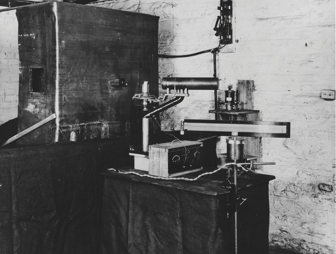 Figure 2. The first page of Compton’s handwritten list “Problems to be Tackled At Saint Louis,” which he composed while returning from the UK in 1920 on the RMS Aquitania. (Courtesy of the Arthur Holly Compton Personal Papers, Washington University Photographic Services Collection, Julian Edison Department of Special Collections, Washington University Libraries.) Figure 3. The x-ray apparatus used by Compton in his experiments. At left is a large lead box, which housed the x-ray source and graphite block. After exiting the lead box, the beam glanced off the calcite crystal (visible at center) and was detected by an ionization tube connected to a four-quadrant electrometer. (Courtesy of the Washington University Department of Physics.)