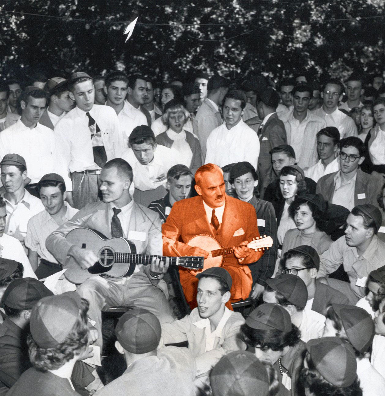 Arthur Compton playing the banjo among a group of students at Washington University in St Louis, circa 1949. (Courtesy of the Washington University Photographic Services Collection, Julian Edison Department of Special Collections, Washington University Libraries.)