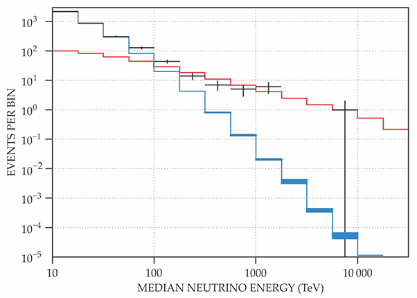 IceCube’s neutrino measurements (black crosses) show that the flux of high-energy, astrophysical neutrinos diverges significantly from the flux of atmospheric neutrinos (blue). The red stepped line is a power-law fit to the atmospheric component. (Adapted from ref. 18.)