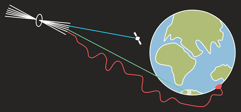 Multimessenger astronomy takes advantage of the many kinds of information that astrophysical events send Earth’s way. This image was adapted from a video in an NSF news release announcing that the IceCube detector at the South Pole observed neutrinos (green line hitting Antarctica) coming from a specific galaxy (upper left) that jets material in our direction; the neutrinos were created by interactions in the jets. At the same time IceCube spotted neutrinos, various telescopes observed electromagnetic radiation (blue line) also produced from jet interactions. Cosmic rays, charged particles (red curve) whose trajectories are bent by magnetic fields, are harder to analyze, but they provide consistency checks. For events such as neutron-star mergers, gravitational radiation is yet another messenger. (NSF, “Neutrino observation points to one source of high-energy cosmic rays,” news release, 12 July 2018.)