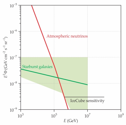 The starburst neutrino flux, according to a 2006 theory paper by Abraham Loeb and Eli Waxman, is approximately consistent with subsequent IceCube observations. In this plot the green area represents possible neutrino flux Φ as a function of energy E. The upper boundary corresponds to a cosmic-ray spectral index s (see main text) of 2.0, and for E < 105.5 GeV, the lower boundary corresponds to s = 2.25. IceCube data are consistent with a spectral index in the range of 2.0–2.2 for energies in the range of 105–107 GeV or so; for lower energies, the measured flux is a somewhat steeper function of energy. The solid red line shows the atmospheric neutrino background. The black horizontal line indicates the observed sensitivity of IceCube. (Adapted from ref. 8.)