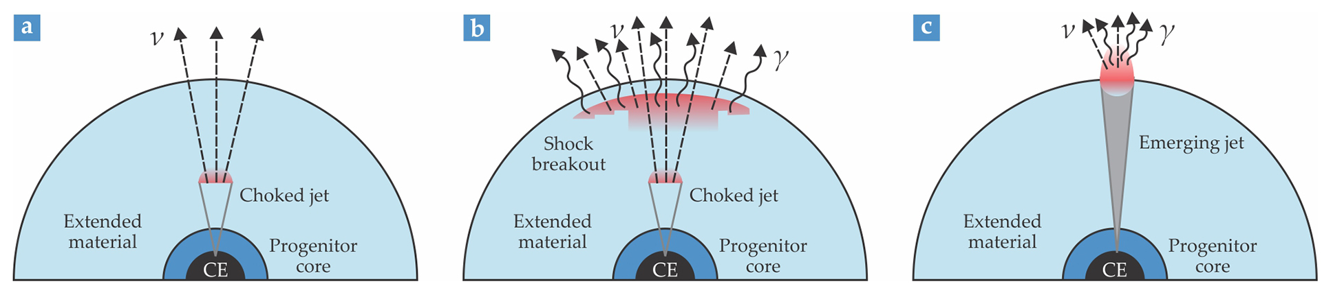 A choked or nearly choked jet from a gamma-ray burst (GRB) produces neutrinos but little or no electromagnetic radiation. The jet is powered by a central engine (CE), the black hole or neutron star and surrounding accretion disk that lie at the center of the GRB. (a) If the jet is choked near the progenitor core of stellar matter surrounding the engine, all the electromagnetic radiation it generates is reabsorbed by the GRB’s extended material (light blue). (b) A barely choked jet produces a shock wave that just breaks out from the GRB surface and produces some electromagnetic radiation. (c) A jet that barely emerges from the GRB produces electromagnetic radiation, but much less than is created by the classical GRBs whose jets fully emerge. (Adapted from ref. 12.)