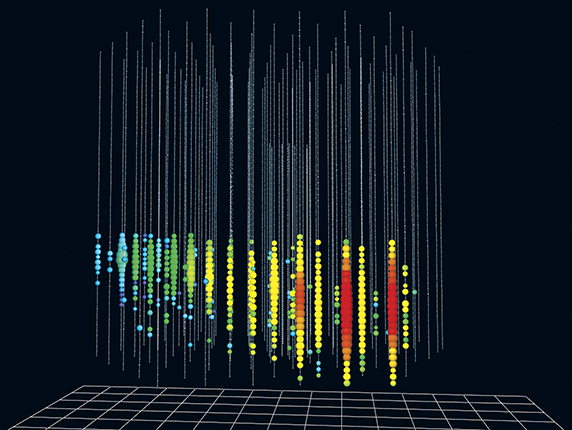 A track of Cherenkov radiation pointing to the blazar TXS 0506+056 was detected by IceCube on 22 September 2017. A high-energy neutrino from the blazar interacted with Antarctic ice and ultimately generated the light seen by IceCube’s underground photodetectors. Each circle indicates a photodetector. Size corresponds to the number of photons observed; color indicates time (red is earliest; blue, latest). The event determined the direction of the neutrino source to better than 1° accuracy. (Courtesy of the IceCube collaboration.)