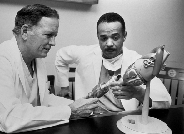 Figure 3. Denton A. Cooley and John C. Norman Jr discuss the placement of a left ventricular assist device, a partial artificial-heart system designed to temporarily sustain patients with failing hearts. Between 1972 and 1974, Norman (right) tested early versions of his cardiac-assist device, powered by plutonium-238, in 15 calves in the research laboratories at Harvard University’s School of Medicine and the Texas Heart Institute in Houston, but with poor results. The calves survived for hours, not days, and problems included device leaks or breaks and internal heat injuries. Norman continued to develop improved pumps with Cooley at the Texas Heart Institute but abandoned 238Pu as a power source. (Courtesy of the Texas Heart Institute.)