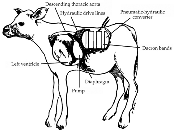 Like the AEC–Westinghouse device, the NHLI’s assist system consisted of two main parts: a heat converter and a blood pump, arranged in the calf’s body as shown in figure 4. The pump attached to the left ventricular apex of the heart and to the descending thoracic aorta, a configuration that allowed the pump to assist the movement of oxygenated blood. Also like the AEC–Westinghouse device, the pump was made of Dacron-fibril-covered silicone and plastic, and it forced blood through the pump’s bladder using a pusher plate. The bladder was clamped in stainless-steel housing and hydraulically driven by an attached 3 kg cylinder, situated in the abdomen, that contained the nuclear heat converter.