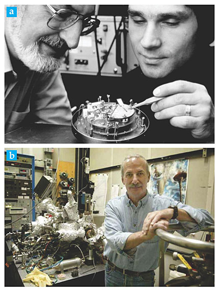 Figure 1. Pioneers of scanning tunneling microscopy.(a) Gerd Binnig and Heinrich Rohrer, shown here with one of their original instruments, invented the scanning tunneling microscope (STM) about 35 years ago. They overcame the conceptual and engineering challenge of placing a macroscopic object—a sharp tip—an atomic-scale distance from a surface and demonstrated atomic-resolution imaging. (b) Donald Eigler stands in front of the liquid-helium-temperature, ultrahigh-vacuum STM he developed at IBM. (Photographs courtesy of IBM.)