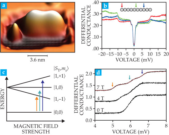 Figure 3. A quantum antiferromagnetic spin chain composed of 10 manganese atoms (adjacent to one standing apart) on a bed of insulating copper nitride over conducting copper. (a) A scanning tunneling microscope assembled the chain one Mn at a time and then imaged it with a nonmagnetic tip. The indistinct structure suggests the presence of delocalized electrons shared among the atoms. (b) As the tip hovers above one of three different locations on the chain, an applied voltage injects current into the surface. The differential conductance spectra depend little on the tip location, and in all three cases, a large step in electrical conductance occurs around ±1 mV due to spin-flipping excitations. Further excitations, at ±2 mV and ±12 mV, take the chain into higher-energy states. (c) If an external magnetic field is added, the degeneracy of the excitations is broken into three distinct states ∣ST, ms〉. (d) In this spectra of a much shorter chain—two coupled Mn atoms—the subtle triplet excitations at 6 mV are fully discernable only when the magnetic field reaches 7 T. (Adapted from ref.