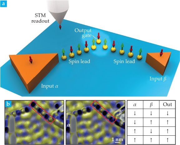 Figure 4. Magnetic logic at the atomic scale.(a) This device consists of two ferromagnetic islands, α and β, that serve as inputs and two spin leads made of iron atoms that serve as wires connecting them. The two spin leads meet in a central spot, where another atom (the output gate) is located, and a logical OR operation is performed. The gate’s spin is then read by a scanning tunneling microscope (STM). (b) Externally applied magnetic fields set the islands’ input states to either up or down, which appear dark blue or green in the STM images. The spin chains each reside in an antiferromagnetic Néel state, so the magnetic state of the atom closest to an island, and therefore the rest of them in the chain, are determined by the island’s input state. As seen in the right STM image, the spins of a six-atom chain flip when input β is flipped, while a four-atom chain remains unaffected. The logic table gives the state of an output gate atom as a function of both islands’ input states. (Adapted from ref.