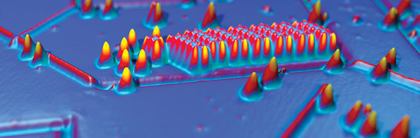 Figure 2a shows an example of an STM- assembled chain of iron atoms on a thin, insulating substrate. 6 When scanned with a nonmagnetic tip, each Fe atom appears identical, as a small bump in the chain. When scanned with a spin-polarized tip, as shown in figure 2b, by contrast, four Fe atoms appear short and the other four appear tall, a manifestation of the change in tunneling current that occurs as the tip encounters opposite spin alignments in Fe as it moves along the chain.
