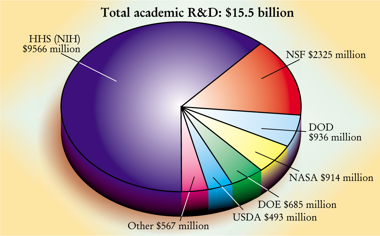 Figure 1. Federally funded academic research and development in the fiscal year 2000 budget. The defense department sponsored about 6% of the total, drastically down from the 20% that it contributed in 1965.